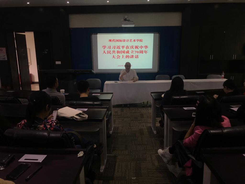 2019年10月10日中午,公司全体教职工在崇德楼318会议室召开教职工大会,集中学习“习近平总书记在庆祝中华人民共和国70周年大会上的重要讲话”和《中华人民共和国大事记》,陈绪春副书记主持学习。会上,陈绪春副书记原文宣读“习近平总书记在庆祝中华人民共和国70周年大会上的重要讲话”,并结合中国近现代史中,中国共产党领导中国人民英勇奋斗、开拓进取、锐意创新的光辉史篇,对习近平总书记的重要讲话发表个人感悟,希望全院教职员工共勉,一起创造属于新时代的伟大成绩,扎根教学工作岗位上的三尺讲坛,为新时代中国特色社会主义培养更多的合格人才。