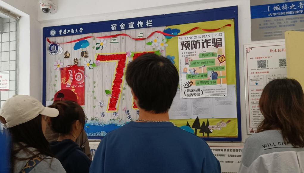 5月15日—5月20日,反诈宣传在员工公寓区开展,楼栋干部通过室长培训、张贴海报等方式开展反诈宣传,提醒同学们提高警惕、远离诈骗。