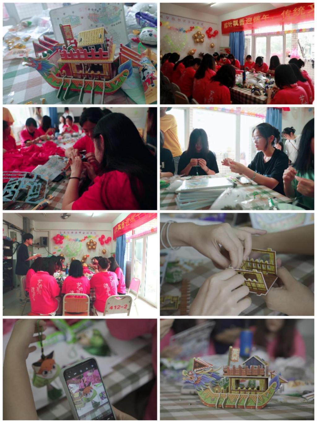 上午9点,同学们纷纷到达公寓区活动室参与缝制端午香包和拼龙舟活动。香囊和龙舟是我国特有的民俗文化符号,蕴涵着深邃的中华民族文化精神。在活动室里同学们一双双巧手下,一针一线的穿连出一个个漂亮的端午节香囊。随后大家一起拼龙舟,现场一片欢声笑语,其乐融融,节日气氛十分浓烈。通过香囊制作,龙舟拼搭,同学们更直观、更生动地认识和体会非物质文化遗产的魅力。