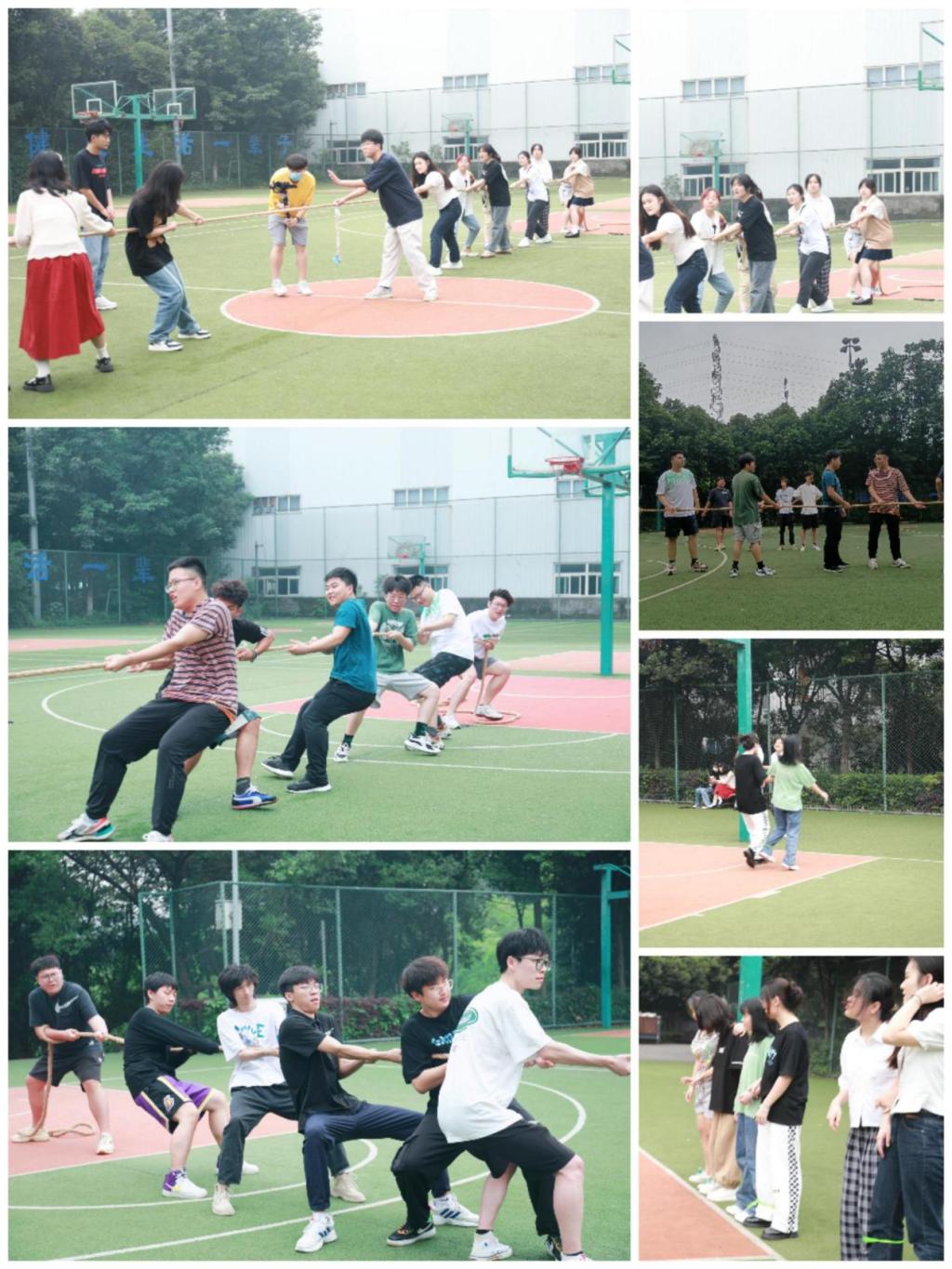 上午10时,同学们来到篮球场进行了拔河比赛和绑腿跑等户外素拓活动,两两一组搭着面颊,拦着腰,携手前行,“1、2!1、2”呐喊迈出整齐的步伐,整个场面既紧张激烈又充满欢乐,加油声与欢笑声此起彼伏,同学们在奔跑中锻炼毅力,协作中增进友谊,比赛中发现快乐。