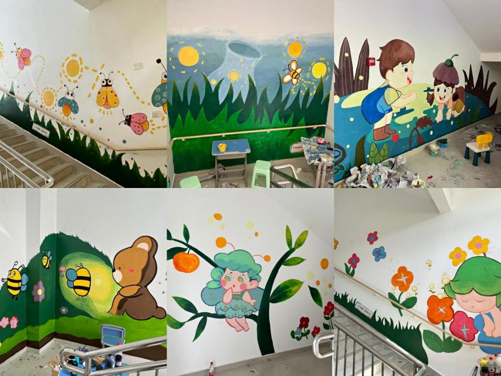 在带队老师的指导下,团队成员分工协作,经过3天时间的反复打磨,总共完成9面墙、100平方米左右的墙绘。一幅幅充满童趣的图画跃然墙上,成为楼道里一道美丽的风景线。