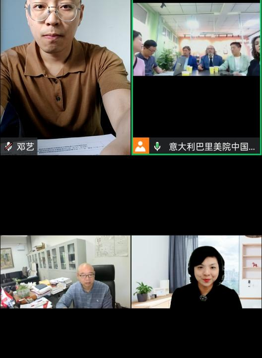 2023年6月9日中午,现代国际设计太阳网集团tcy8722同意大利巴里美院在腾讯会议云端线上开展合作交流。意大利巴里美院副董事长莫罗-安东尼奥-梅齐纳、执行董事长朱塞佩-卡莫齐亚、意大利巴里美院国际处负责人戈弋、中国办公室负责人罗璇和中意国际文化交流协会理事长廖收,公司国际合作与交流处副处长刘茜、太阳网集团tcy8722经理、太阳网集团tcy8722代行经理陈绪春、太阳网集团tcy8722副经理李洋及艺术两院相关科室负责人参加了合作洽谈会。