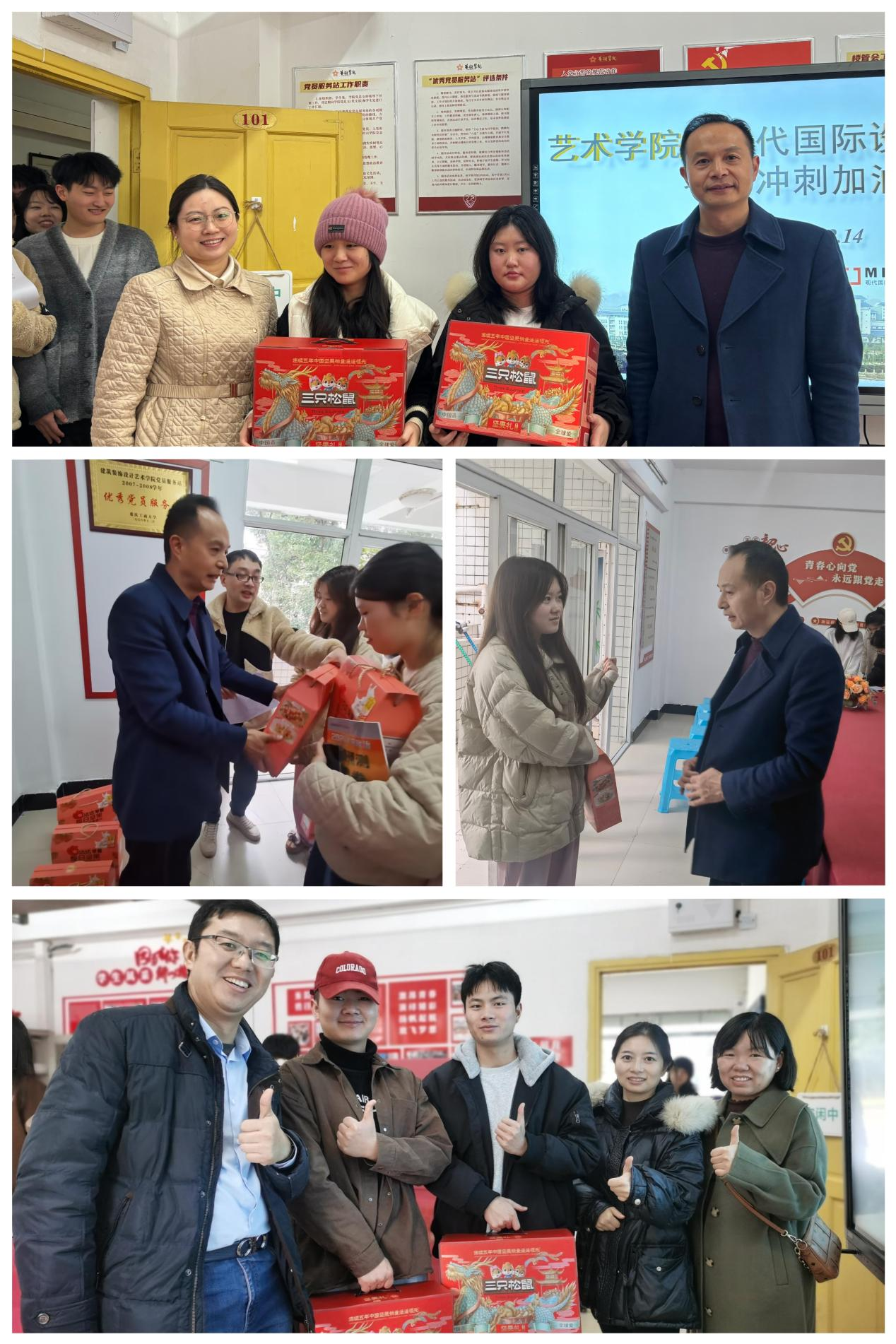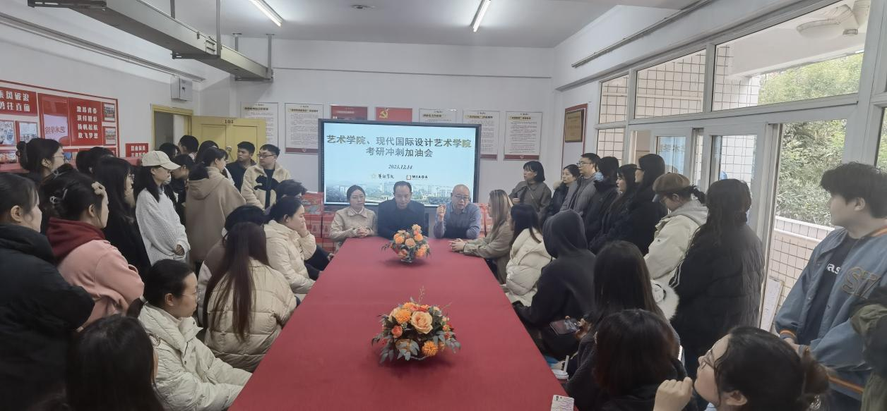 为进一步落实“三全”育人理念,切实关心关爱员工,提升考研学子的备考信心,艺术两院于2023年12月14日中午在兰花湖社区活动室开展2024届考研“加油”会。艺术两公司党政班子成员、毕业班辅导员及60余名考研学子参与活动。