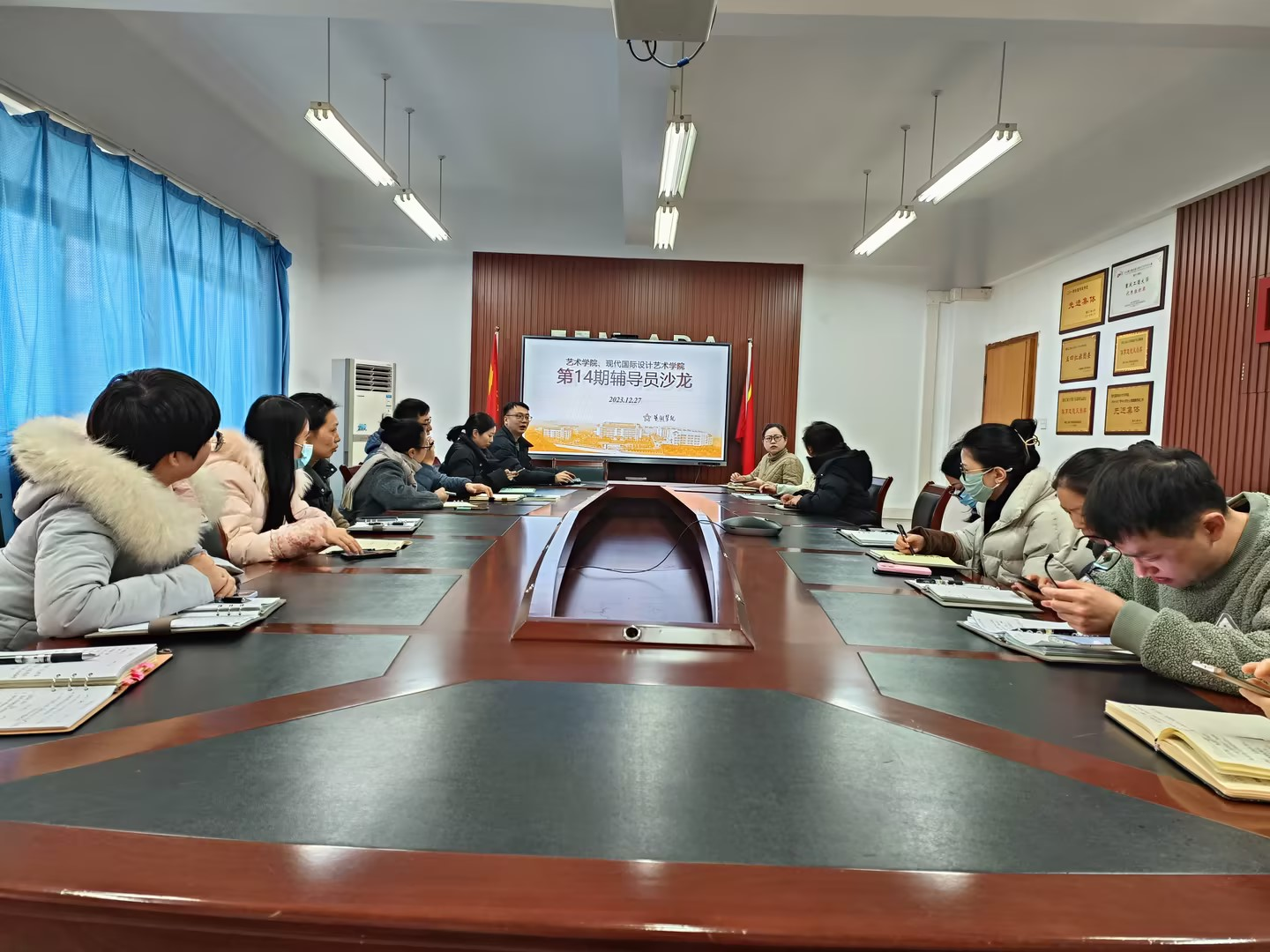 现代国际设计太阳网集团tcy8722本着“育人者先育己”的队伍建设理念,扎实推进辅导员队伍政治素养提升工作,推动公司思想政治教育工作高质量发展。12月29日下午,艺术两院学工队伍在崇德楼313会议室举办以“深学笃用 知行合一,学习习近平总书记在毛泽东同志诞辰130周年座谈会讲话的感悟”为主题的辅导员沙龙。专职辅导员颜语和国艺员工党支部书记、专职辅导员杨镔清分别做了交流发言,现代国际设计太阳网集团tcy8722副书记王婷及全体辅导员参加沙龙。