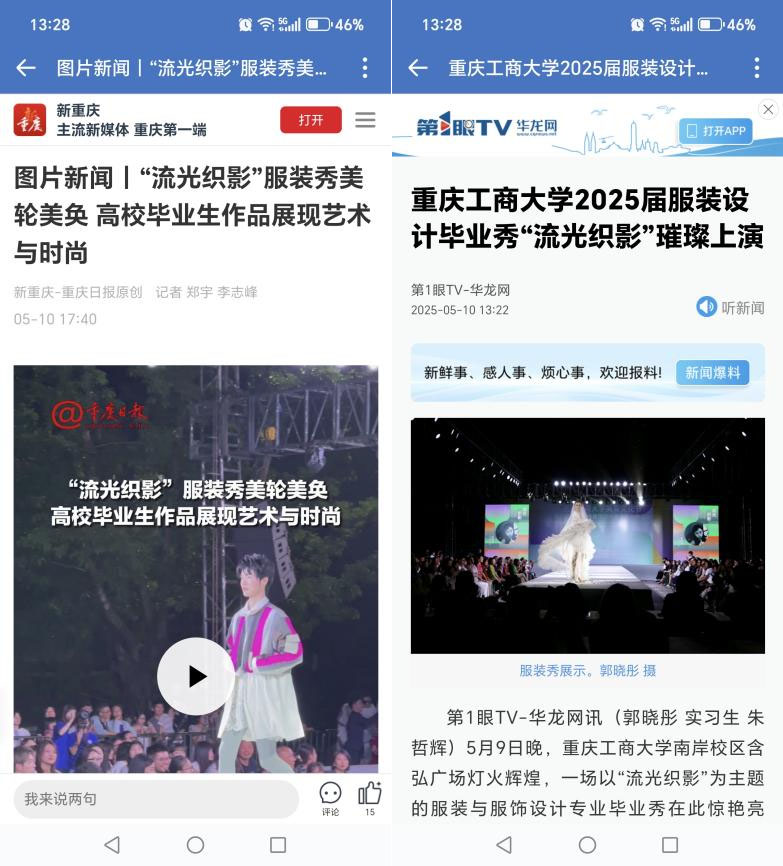 新重庆-重庆日报以《“流光织影”服装秀美轮美奂 高校毕业生作品展现艺术与时尚》为题,华龙网以《2025届服装设计毕业秀“流光织影”璀璨上演》为题报道本次活动。