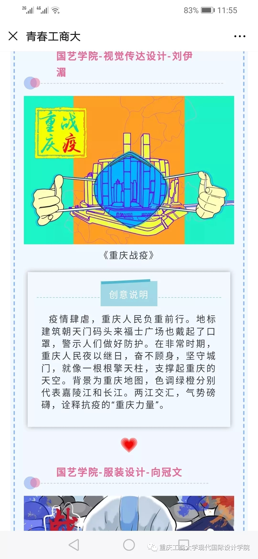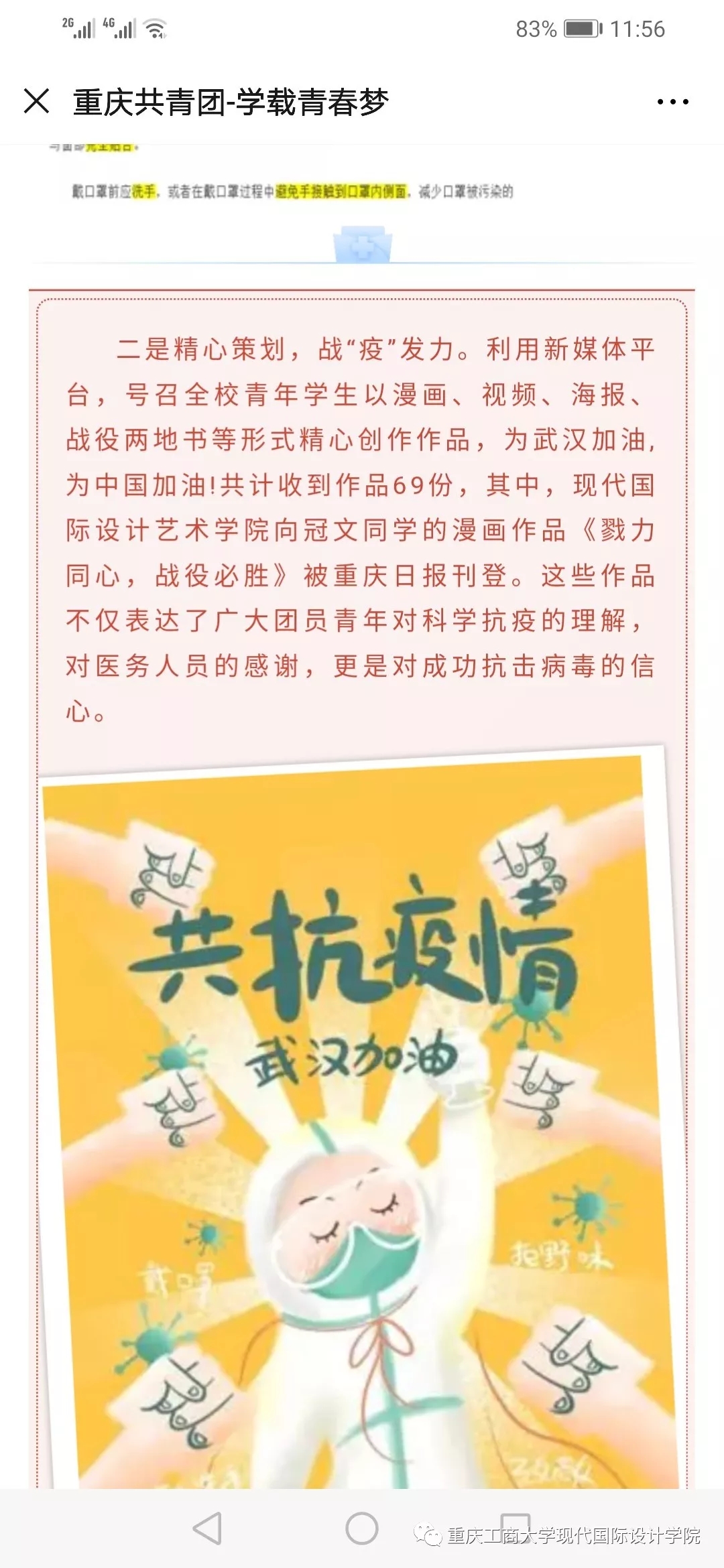 新冠肺炎疫情期间,国艺青年学子积极响应政策号召,潜心在家用自己的画笔支持抗疫情“战役”,2016级张睿等、2017级刘伊湄等、2018级向冠文等员工创作的抗疫情主题漫画作品在公司级、省部级、国家级多个层次的新媒体平台公开展示。