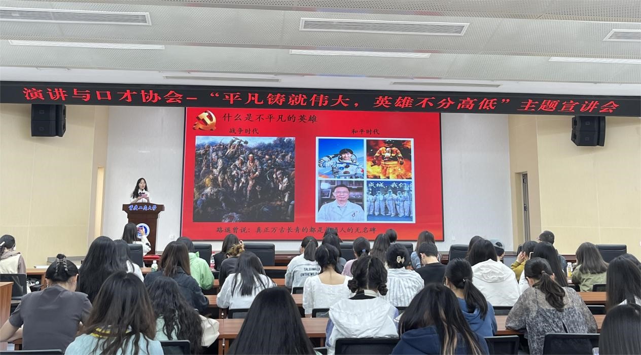平凡铸就伟大,英雄来自人民!在此次宣讲大会中,来自演讲与口才协会的优秀宣讲员们声情并茂地讲述了一个个感人肺腑的平民英雄故事。无论是生如夏花,从容赴死的刘福兰,还是做本职工作,扬匠人精神的张秉贵,抑或是清澈的爱,只为中国的陈祥榕,无不让观众产生高度共鸣。为此,王婷老师也总结到:生活的常态是平凡,但平凡也蕴含着伟大的力量,每位师生要有一双善于发现平凡中蕴含伟大力量的眼睛。