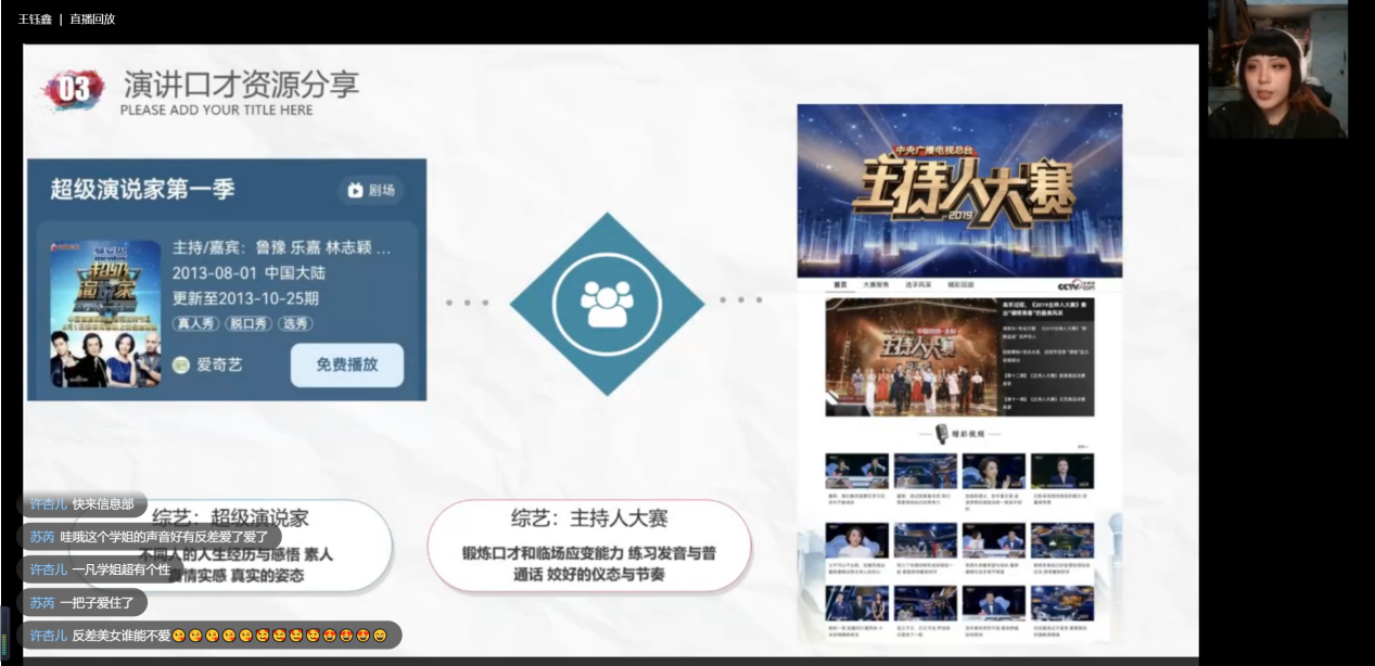 在本次活动中,来自太阳网集团tcy8722演讲与口才协会的成员们以丰富的案例、详实的知识为主线,详细讲解了演讲技巧、话题构思和演讲实践等方面的知识。演讲部林雅欣部长生动的演讲案例分享、宣讲部张艺千部长完备的宣讲技巧解读、主持部叶果部长专业的主持发音介绍、信息部夏一凡部长带来的演讲资源分享以及丰富的观众互动环节,激发了观众们内心深处对表达自我的渴望。
