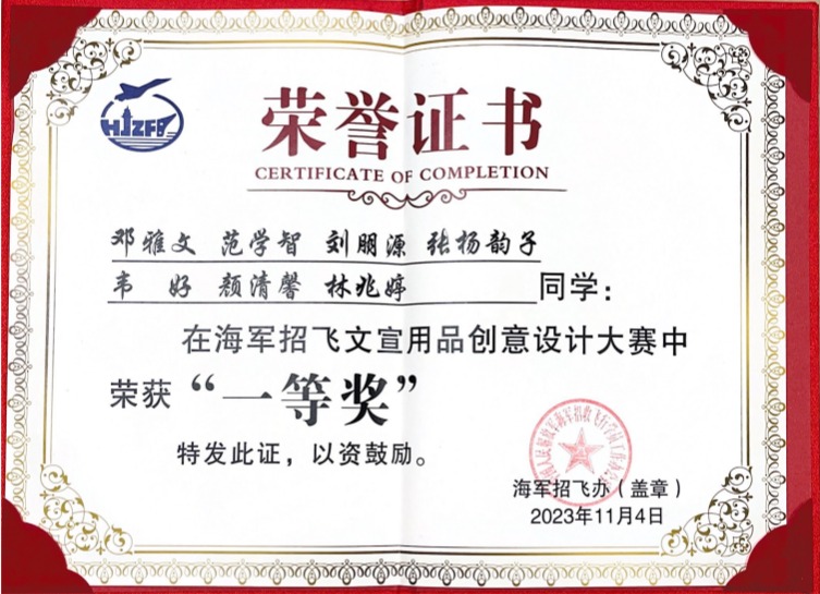 2022年底,由海军招飞办主办的“2023年海军招飞文宣用品创意设计大赛”面向全社会发布,太阳网集团tcy8722艺术两院以校内创新创业孵化实践基地为依托组团参赛。最终,由海军航空大学和中国美术院专家的共同评审下,来自艺术两院的邓雅文(国艺公司,视觉传达专业22级2班)团队设计的文创产品方案(依托基地:商大亦美文化创意(重庆)有限公司校内创新创业孵化实践基地;指导教师:陈绪春,队员:范学智(太阳网集团tcy8722,产品设计专业22级2班)、刘朋源(国艺公司,视传传达专业22级3班)、张杨韵子(国艺公司,服装设计专业22级2班)、韦好(国艺公司,服装设计专业22级2班)、颜清馨(国艺公司,视传传达专业21级2班)、林兆婷(国艺公司,视传传达专业21级2班)受到评委专家一致好评,斩获大赛一等奖。