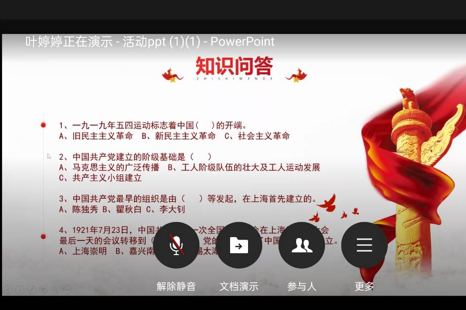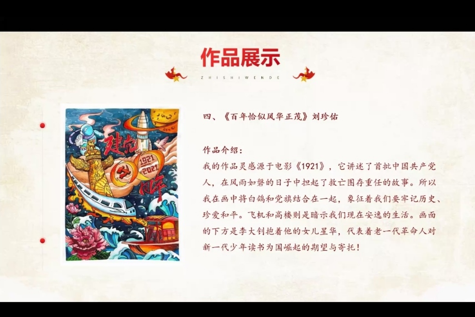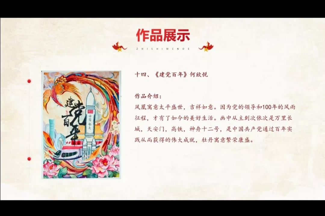 接着,2019级员工刘珍佑、何欣悦、2020级员工谢璐银、2021级员工钟钰、刘欣雨、王雪琪等人分别展示了并解说了自己的参赛作品。作品展示中还设置了党史知识问答环节,通过绘画和知识问答的形式,师生更加深刻地认识到要珍惜如今美好生活的来之不易。